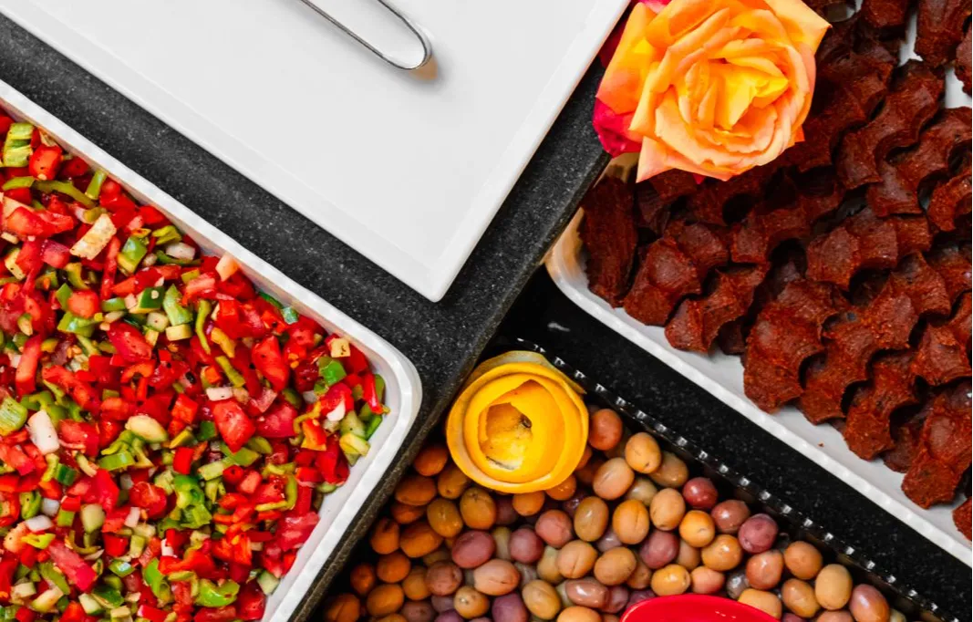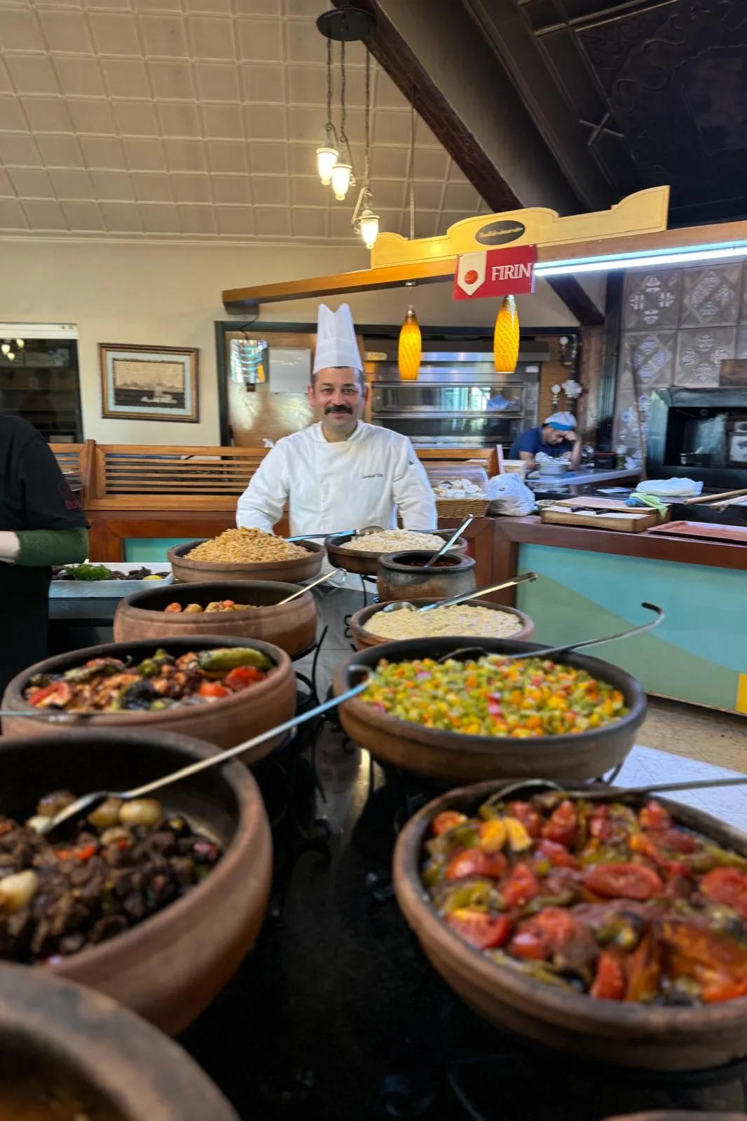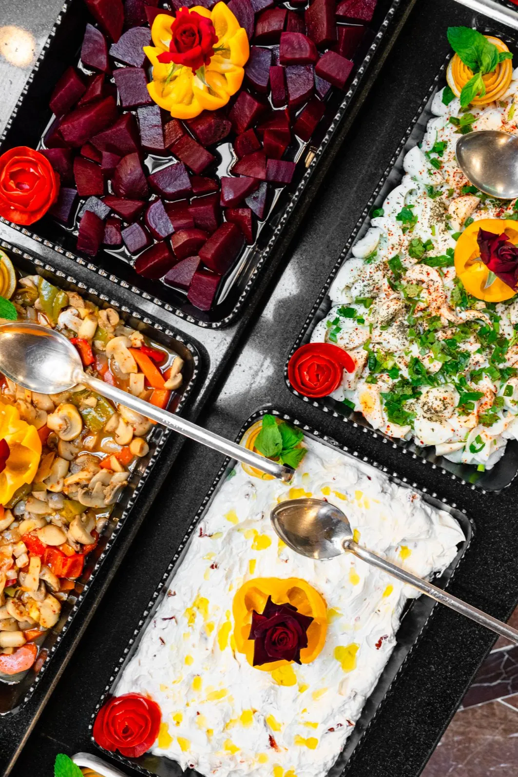 🍴 3 çeşit et (kuzu, dana ve köfte) ve 1 çeşit tavuk yemeği, Sebze yemeği, Güveçte bakliyat (Fasulye, Nohut)